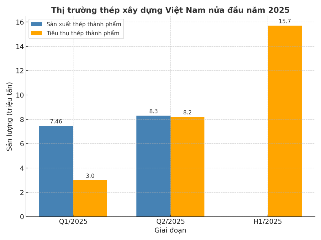 Trong Quý I/2025, ngành thép Việt Nam ghi nhận sự tăng trưởng tích cực. Sản lượng thép thô đạt hơn 5,81 triệu tấn, tăng 9,1% so với cùng kỳ năm trước. Sản xuất thép thành phẩm đạt khoảng 7,46 triệu tấn, tăng 5,7%. Riêng thép xây dựng, sản lượng bán ra đạt hơn 3 triệu tấn, phản ánh nhu cầu nội địa gia tăng đáng kể. Đây là giai đoạn chứng kiến sự trở lại mạnh mẽ của ngành sau thời kỳ trầm lắng.