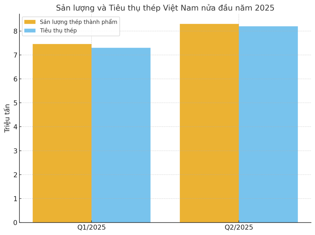 Tại Việt Nam, bức tranh lại có phần tươi sáng hơn. Theo Hiệp hội Thép Việt Nam (VSA), trong nửa đầu năm 2025, sản lượng thép thành phẩm đạt gần 15,83 triệu tấn, tăng 9,7% so với cùng kỳ 2024; tiêu thụ đạt khoảng 15,73 triệu tấn, tăng 10,2%. Nhu cầu nội địa tăng mạnh nhờ đầu tư công, các dự án hạ tầng trọng điểm và sự phục hồi của ngành xây dựng. Đặc biệt trong quý II/2025, sản lượng thép thành phẩm đạt hơn 8,3 triệu tấn, tăng 13,4% so với cùng kỳ, cho thấy thị trường nội địa là động lực tăng trưởng chính.