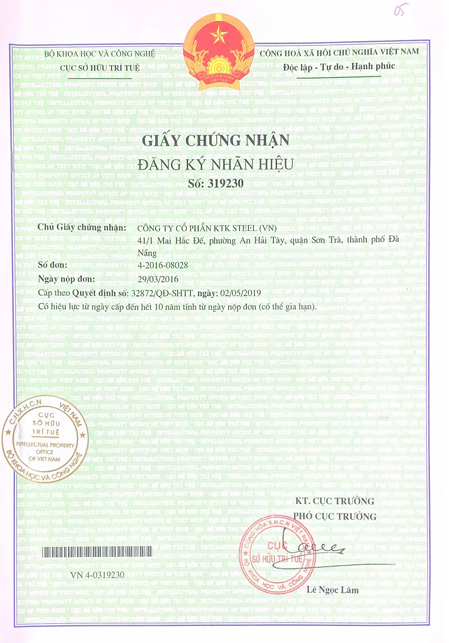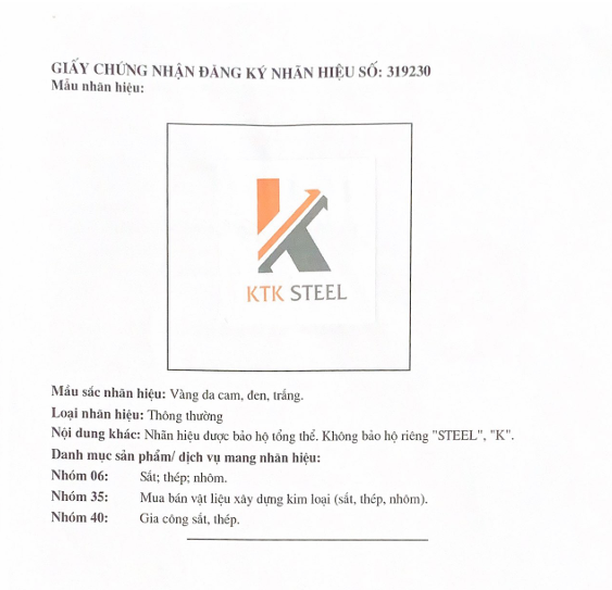 Nhãn hiệu KTK STEEL hiện đang được Cục Sở hữu Trí tuệ – Bộ Khoa học và Công nghệ bảo hộ theo Giấy chứng nhận đăng ký nhãn hiệu số 319230.
